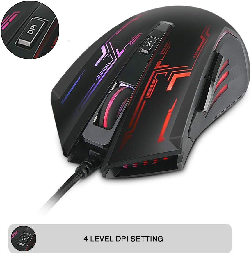 - 4 DPI Levels - Four color RGB breathing light cycle replacement. 4-type DPI rating controlled by touching the DPI button: red 1200DPI, blue 1600DPI, green 1600DPI & purple 3200DPI.
